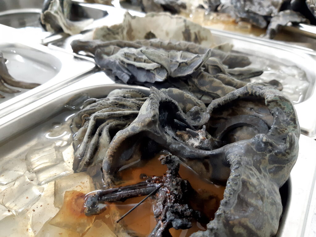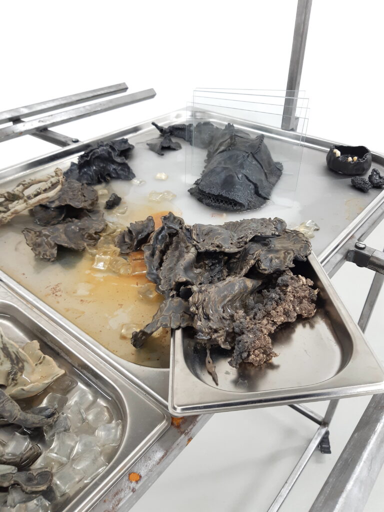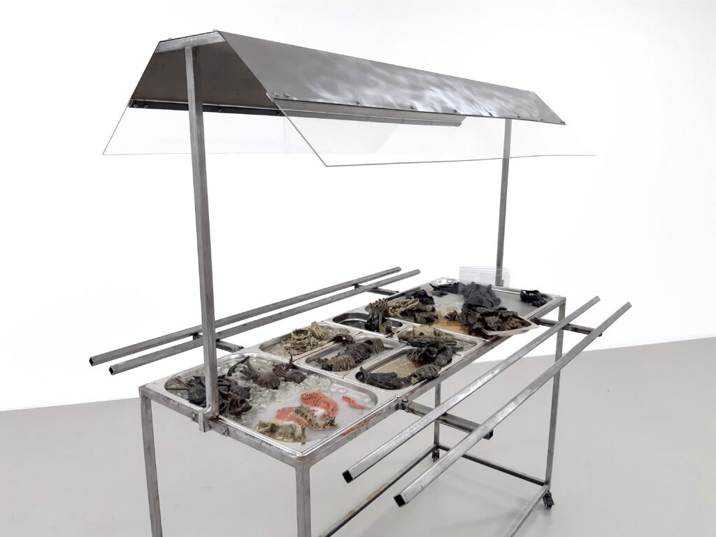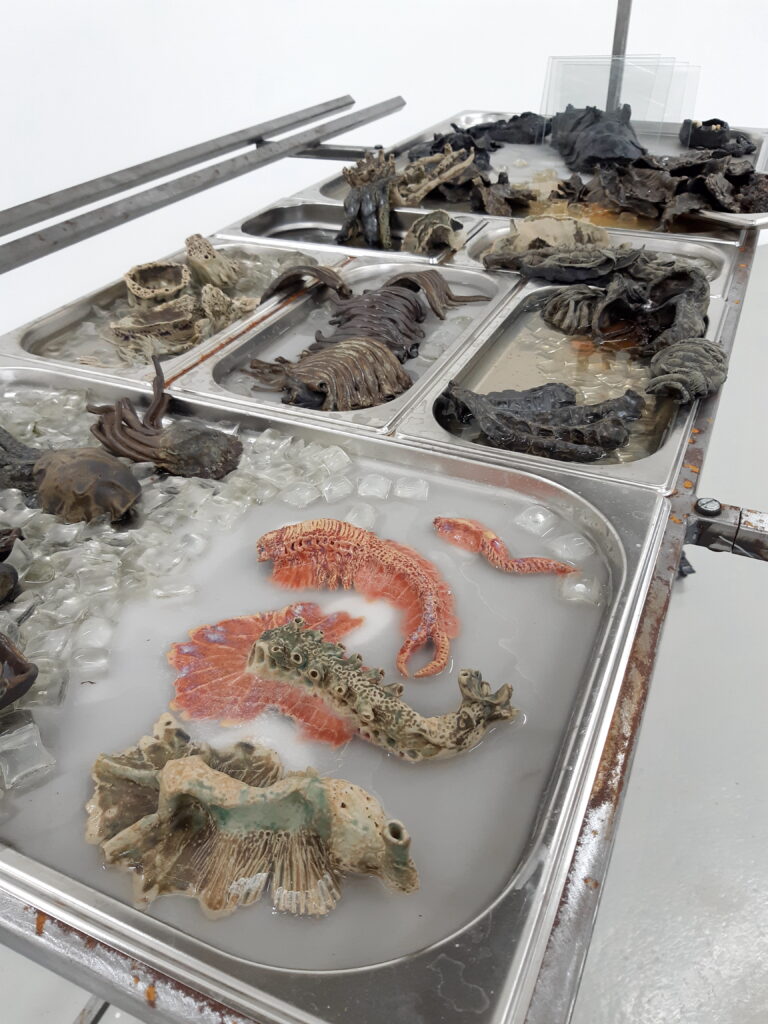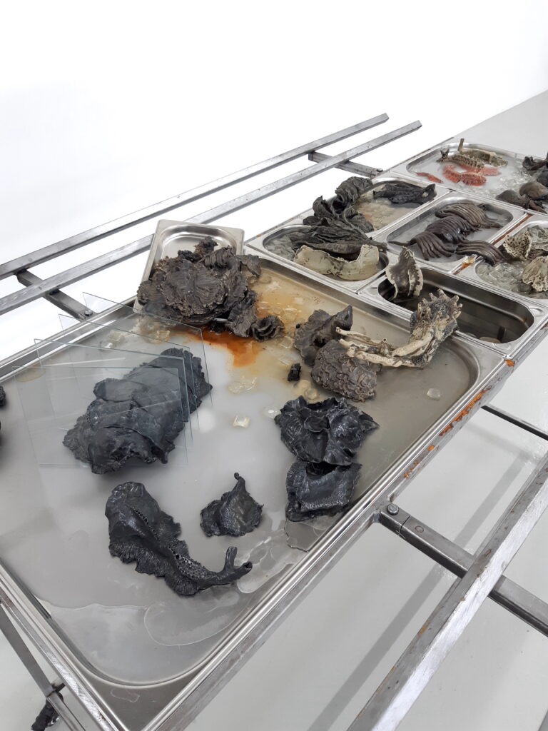 Wie könnte ein Selbstbedienungs-Buffet unmittelbar vor dem systemischen Kollaps aussehen? Volker Grahmann und Jana Thiel haben zu dieser Fragestellung eine pre-apokalyptische Buffetauslage aus Baustahl konstruiert, die sie mit Objekten aus Keramik, Bronze, Stein und Kunststoff bestückt haben. Die Objekte bilden Amalgame aus vermeintlich natürlichen aquatischen Pflanzenteilen, Meerestieren und anderen Organismen, welche eine Nähe zu den Biokorrosions- und Zersetzungsprozessen im Ökosystem Meer haben sowie zu künstlichen zivilisatorischen Artefakten.